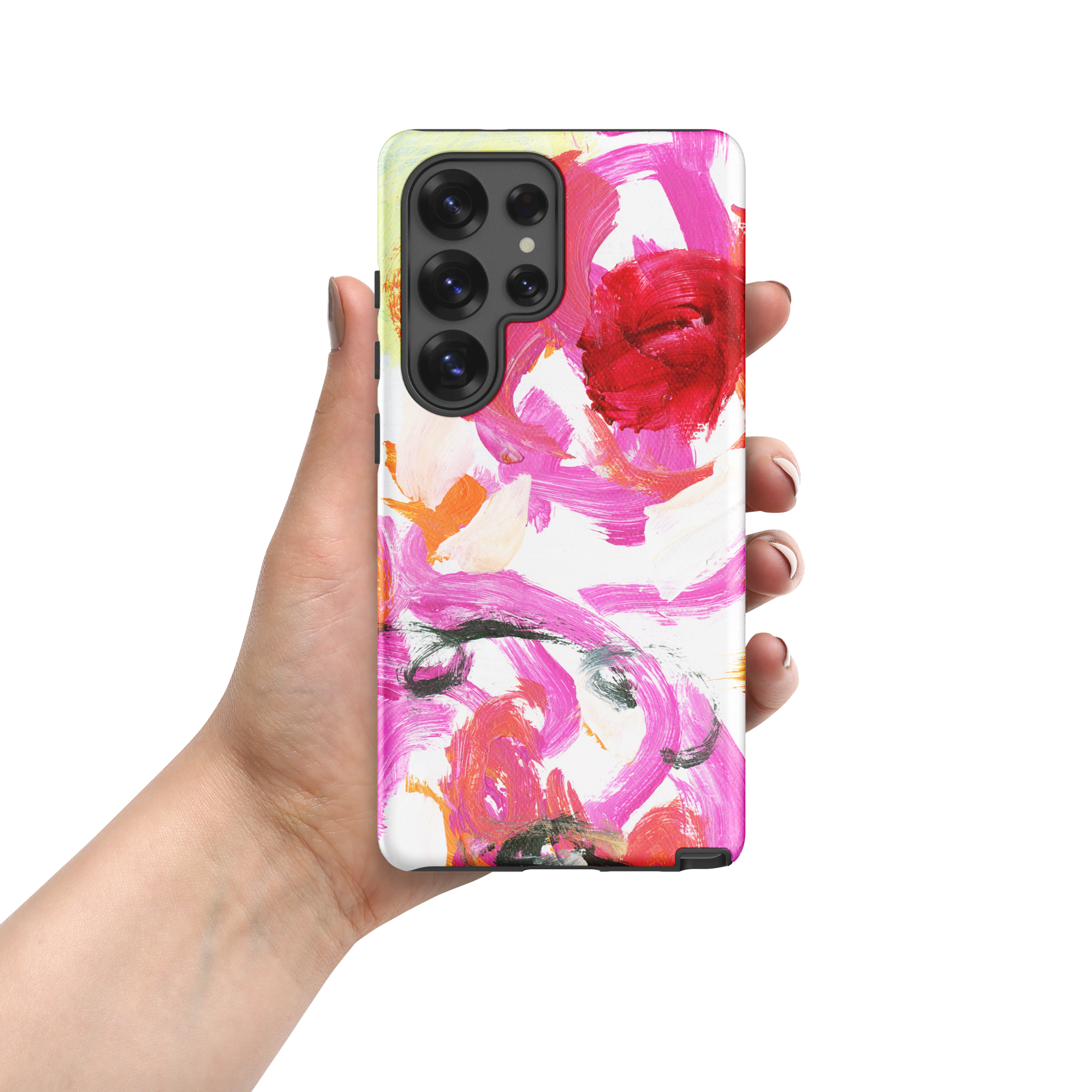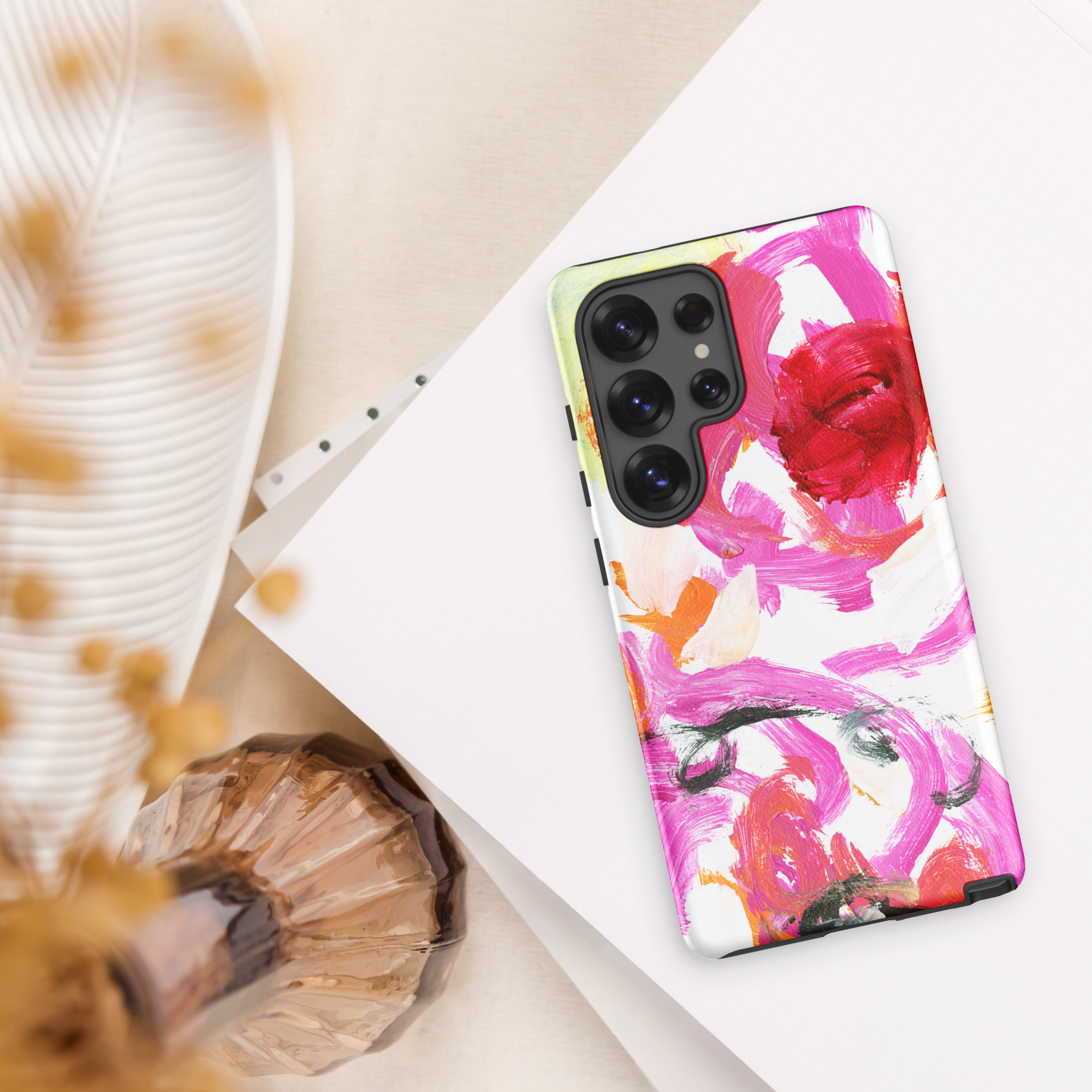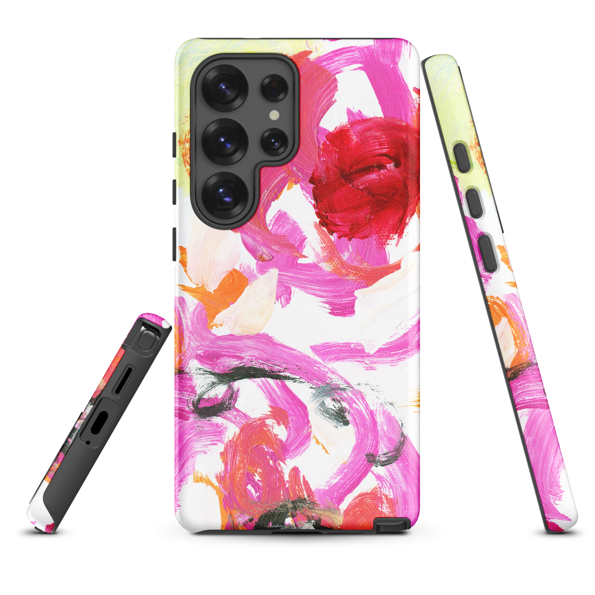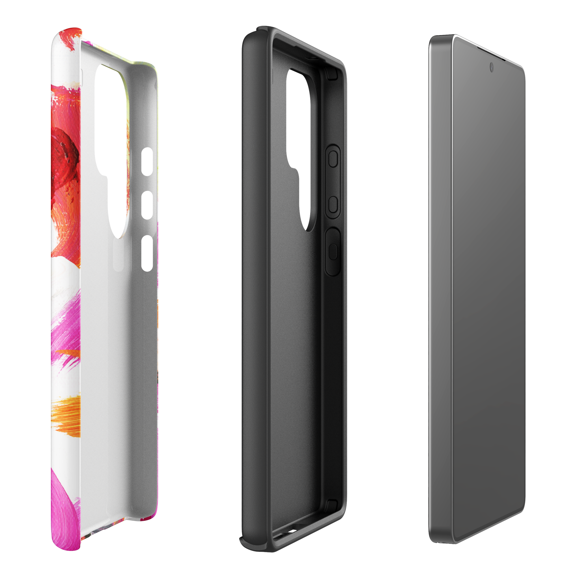 • Pops of bright pink, red, and orange in expressive brushstrokes — each case a portable piece of art