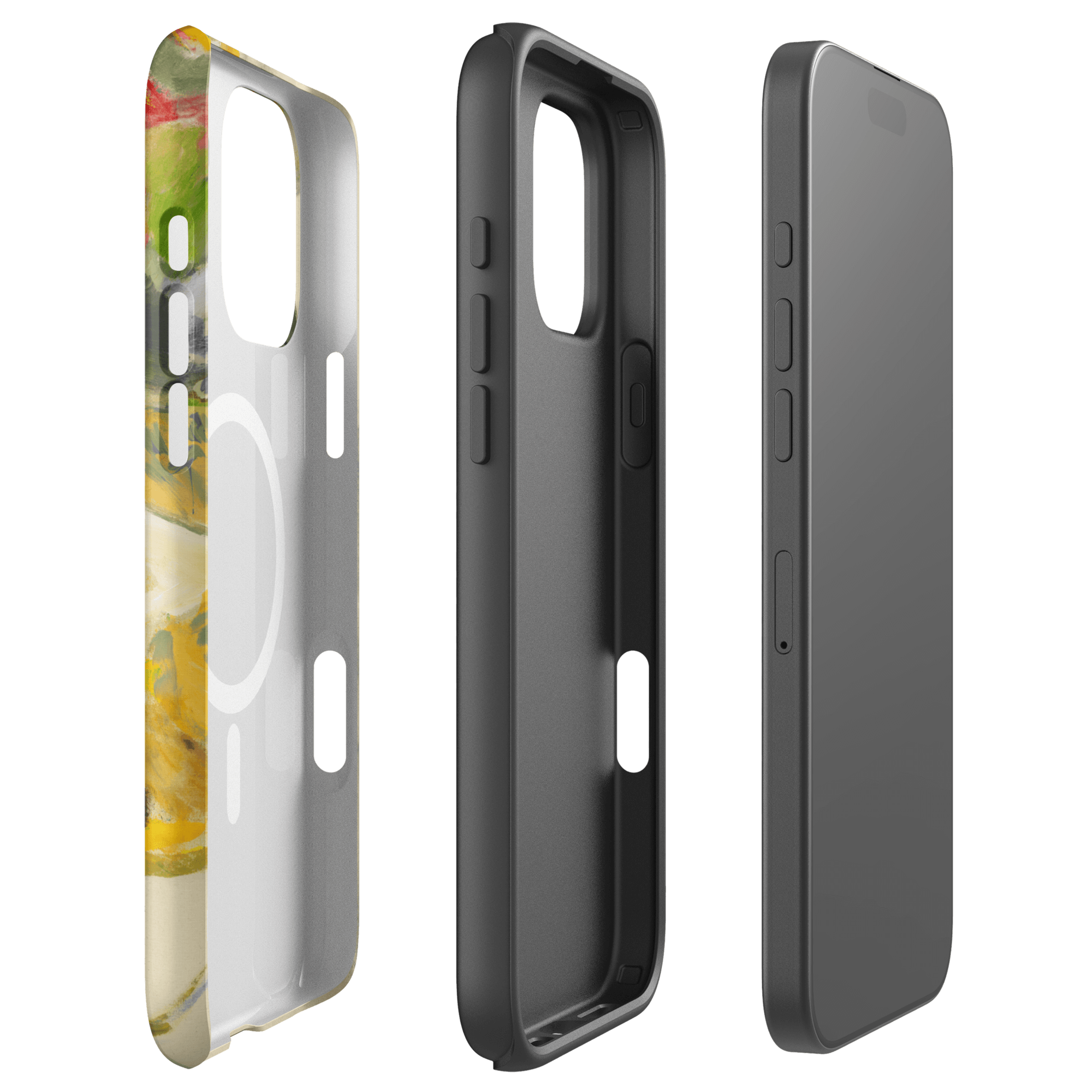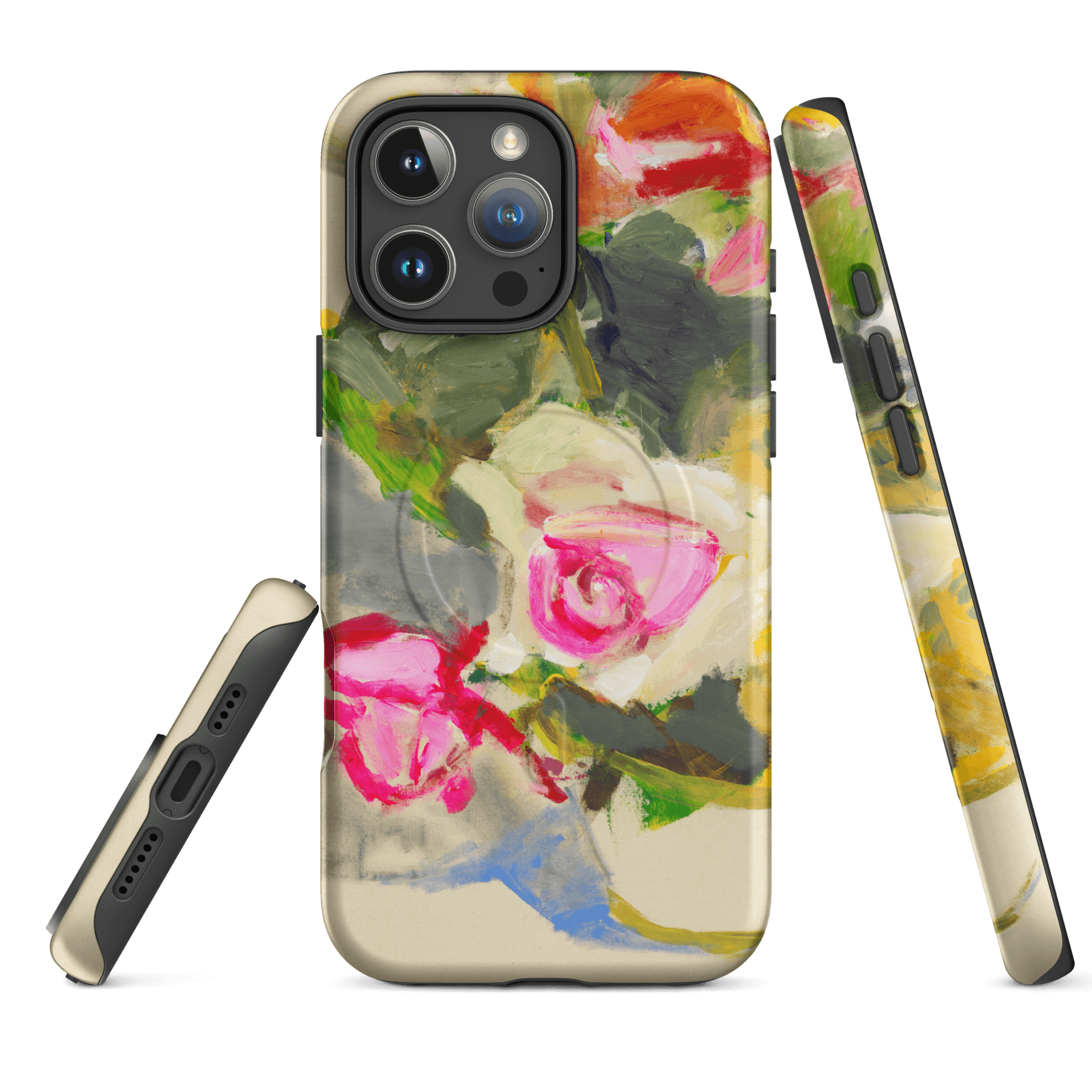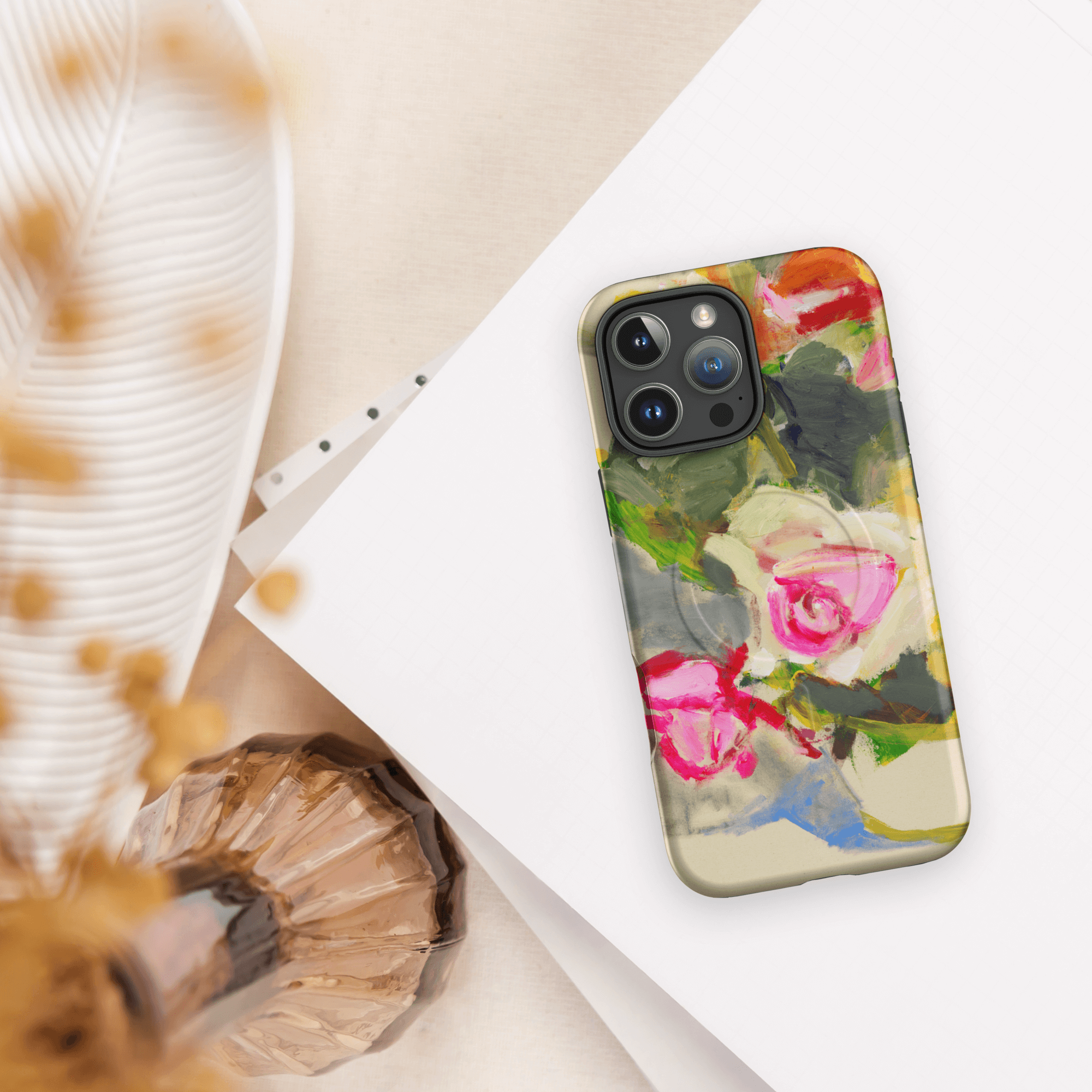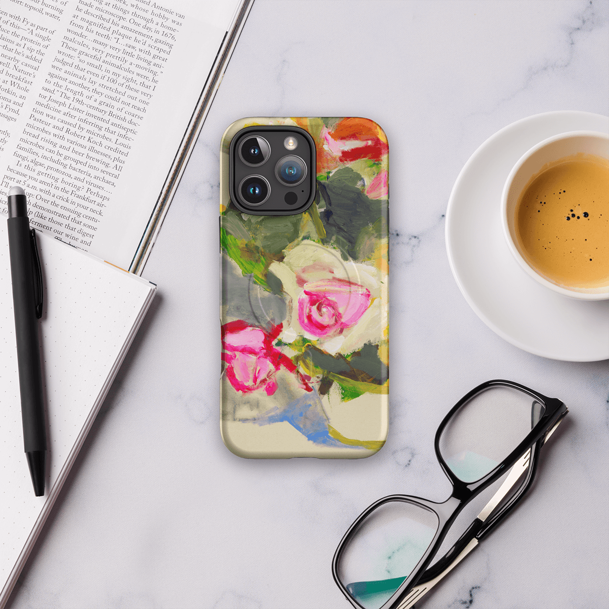Wrap your phone in timeless charm with the Bouquet On Linen MagSafe Tough Case — an elegant fusion of soft florals and painterly brushstrokes. This design captures the beauty of blooming pink roses set against lush green and golden hues, evoking the warmth and romance of an impressionist garden painting.