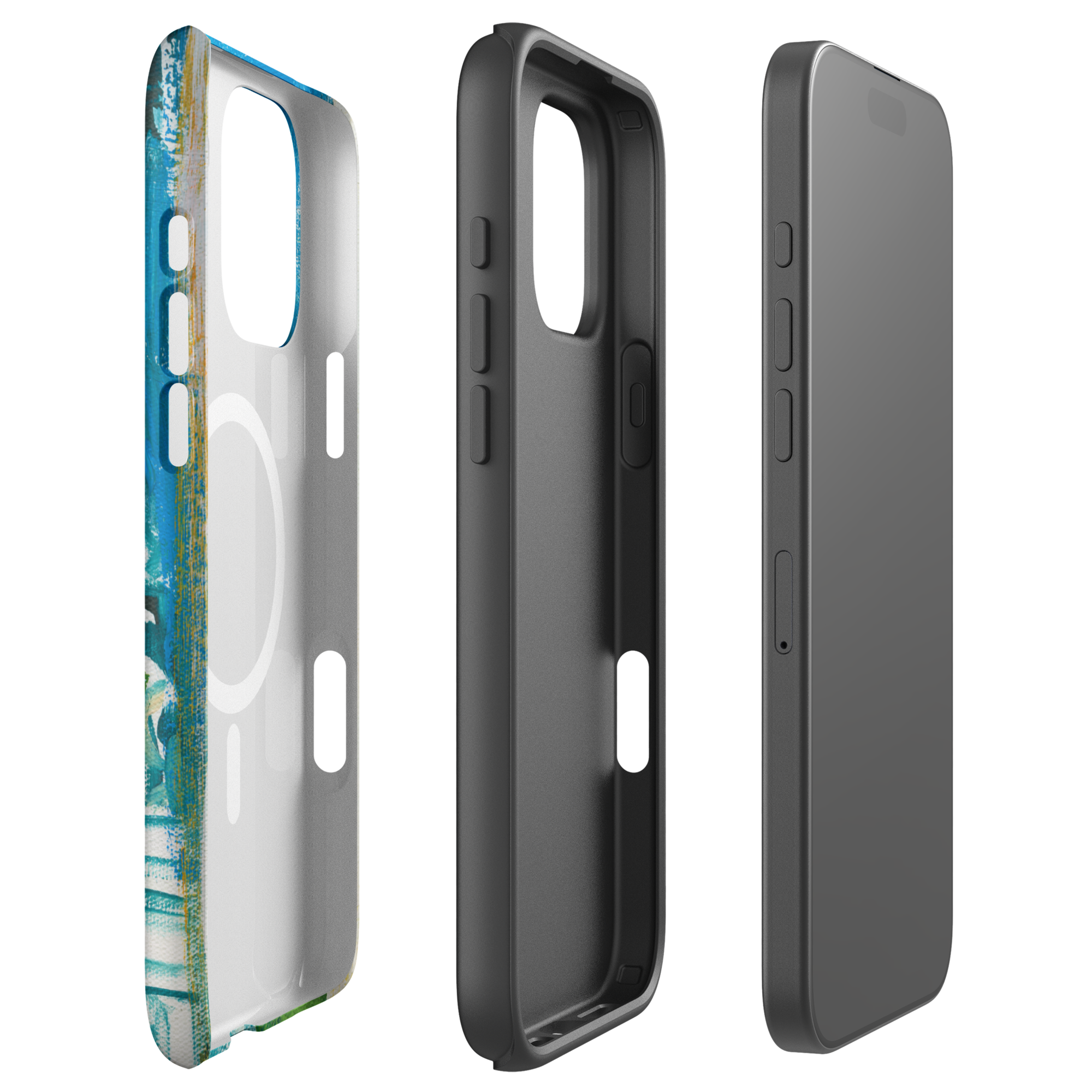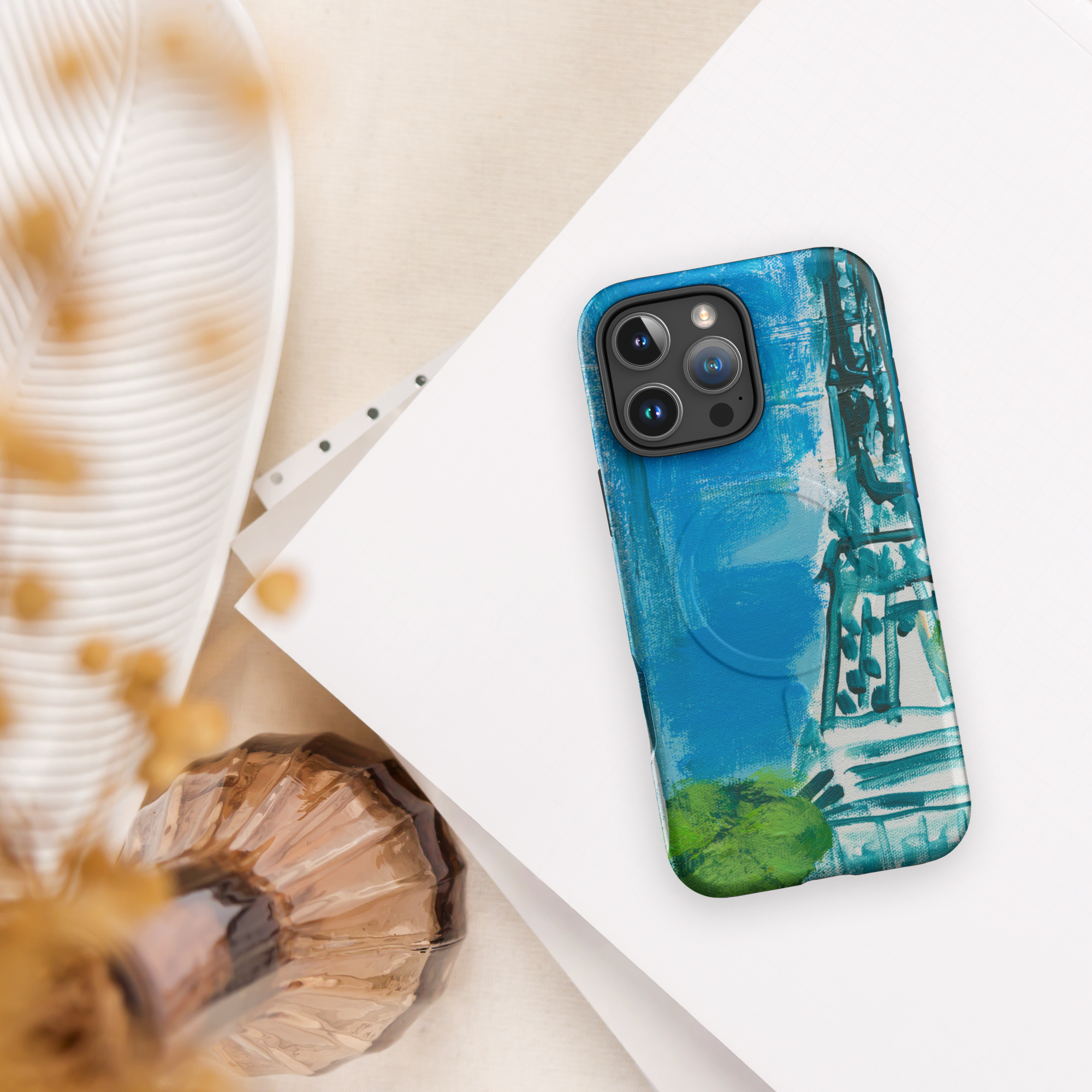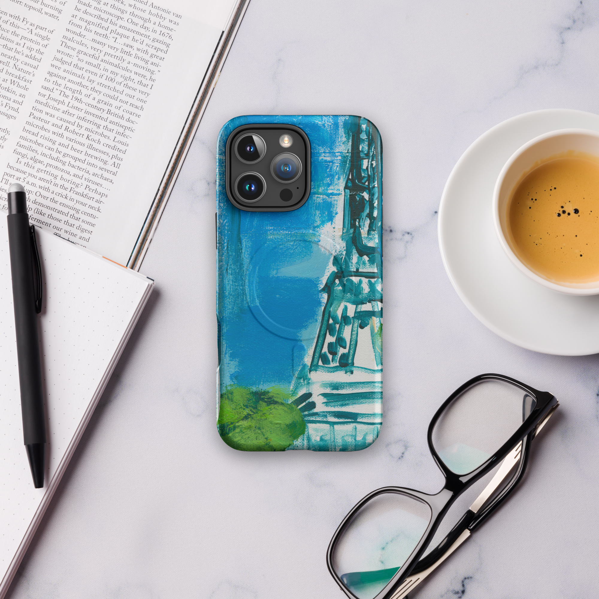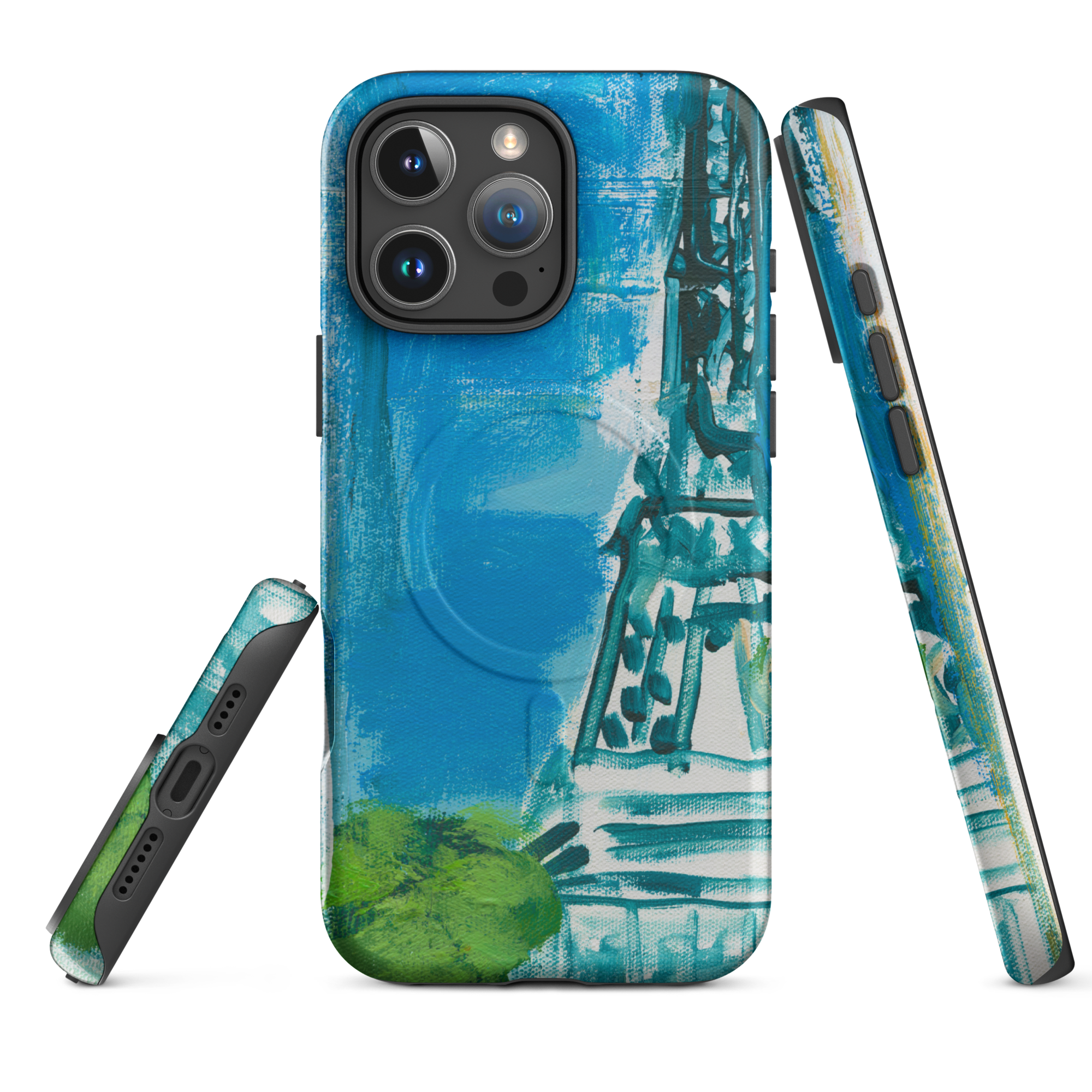 This phone case features an original impressionist-style painting of the Eiffel Tower, captured in vivid blues and lush greens. A modern, romantic take on the City of Light — dreamy, bold, and effortlessly chic.